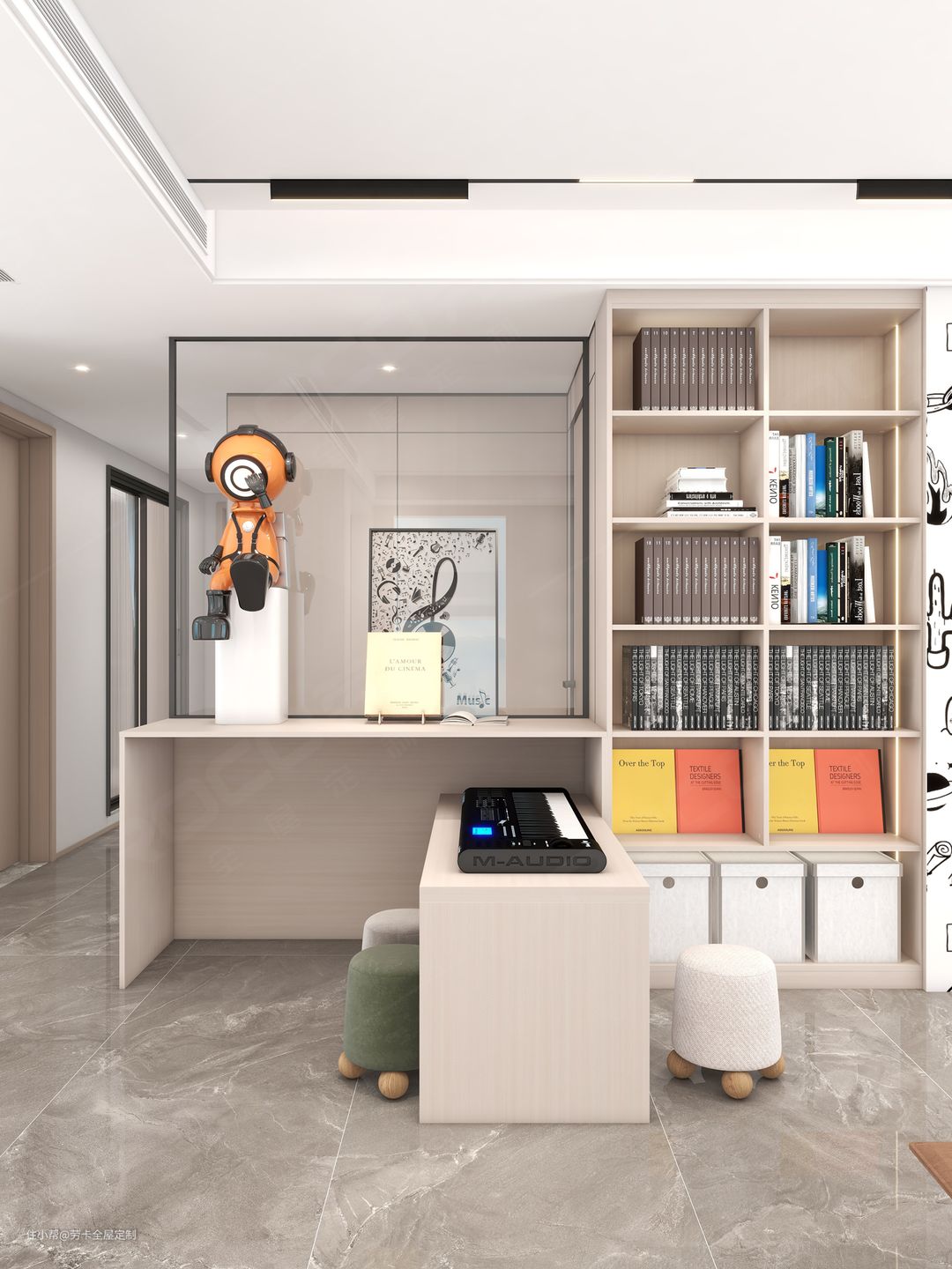 客厅与次卧门口之间巧妙用玻璃隔断,既不会让公共区域显得拥挤,又被灵活的设计成练琴空间。