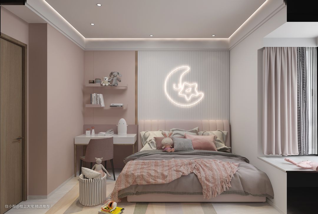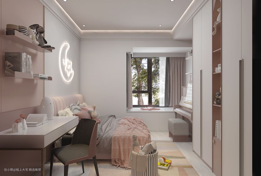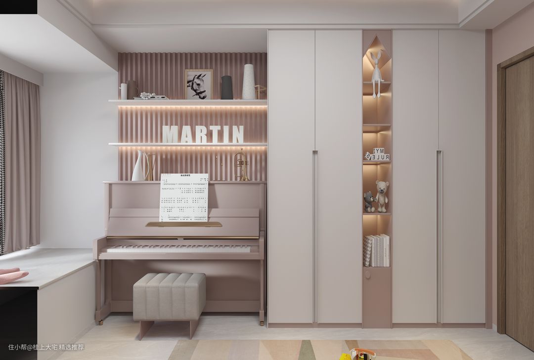 业主家里有一个女孩,家人希望以后她学习之余也能练习钢琴,所有在房间给女儿方摆放了钢琴,装成一个粉色公主房