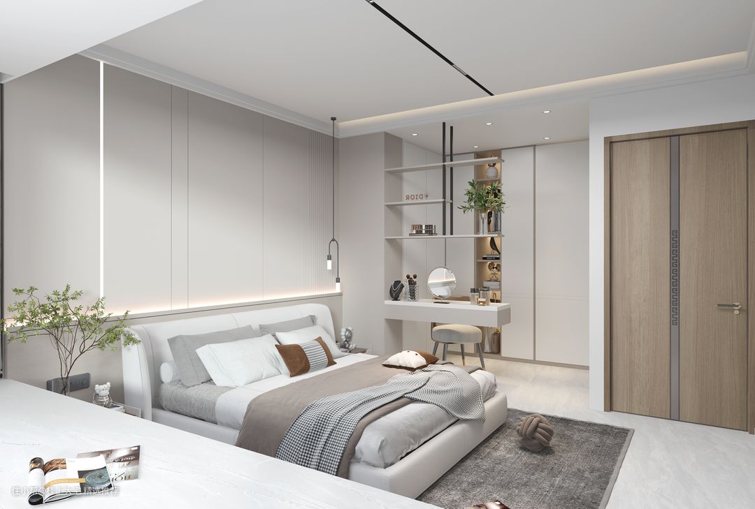 主卧采用的是无主灯设计,原本衣帽间的区域,打一个门洞过去到厕所,然后在衣帽间位置做衣柜结合做了一个属于女主人的梳妆台