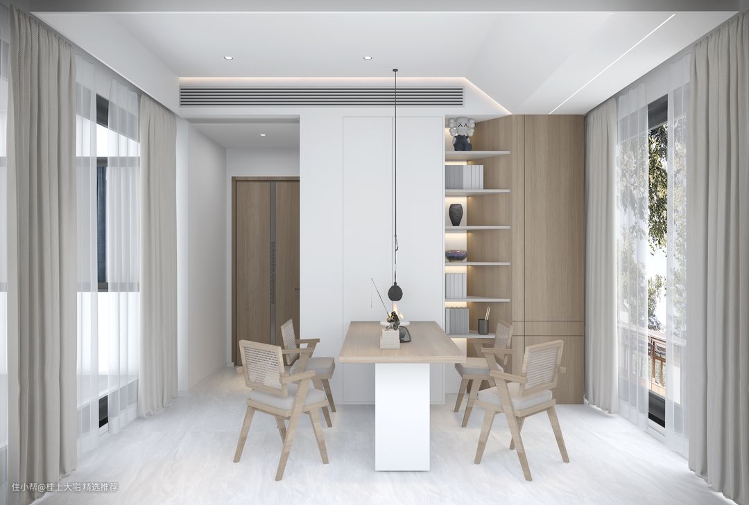 女主人喜欢平常周末跟小孩在家里做西点蛋糕的,设计师在餐厅位置做了一个岛台结合餐桌,这样可以让女主人在做蛋糕的时候根小孩互动
