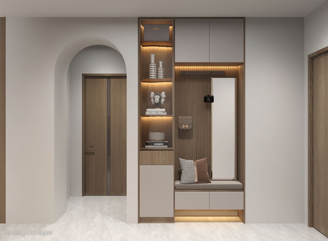 入户原本是厕所,有部分墙体不是承重墙,设计师考虑到家里有两个小孩,所有拆掉原本的墙体设计了一个换鞋区,方便进出的时候坐着换鞋,
