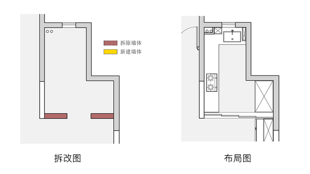 厨房与餐厅的隔墙(非承重)拆除之后,会形成餐厨一体的空间,同时进入室内的光线也会减少遮挡,整体采光会有很好的提升。