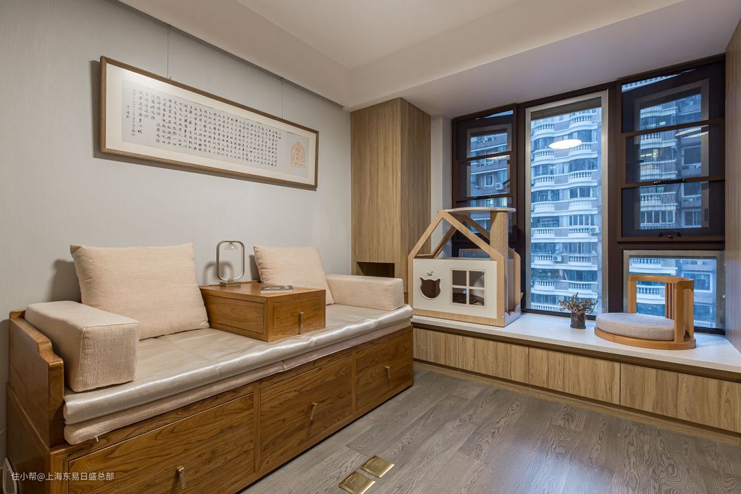 两位老人养了一只猫做伴,希望能够给到宠物最悉心的关照。我们将书房阳台充分利用起来,做了休闲飘窗,方便老人随时晒太阳,同时将猫窝安置在此处,方便老人照看小猫,同时也方便通风。