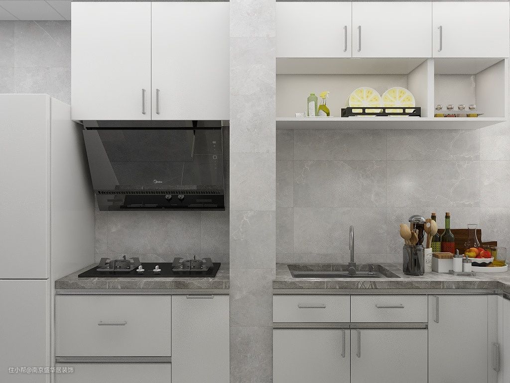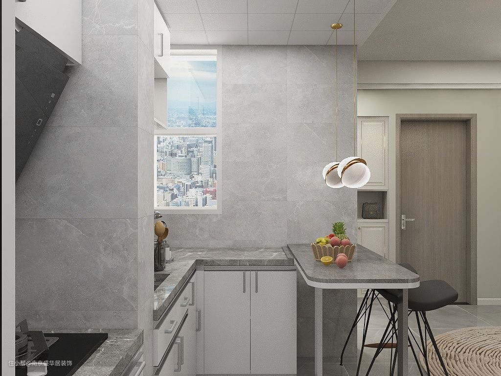即使是小户型,也要有烟火气息,进门右手边开放式厨房,厨房是家里颜色最深的地方,比较独立的一个小空间,脱离了家里现代简约的浅色,加上一个小吧台,吧台上面金属色吊灯,这个角落早上属于咖啡,晚上属于酒精。