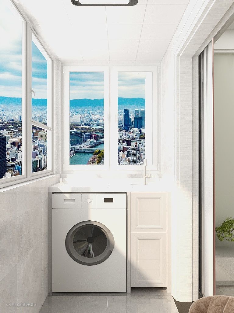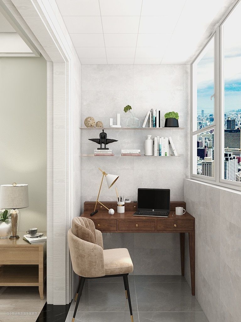 小阳台贴着隔断的墙做了书桌放东西,工作,看书都很方便,阳光从窗户里洒进来,感觉可以在这里呆一个下午。
