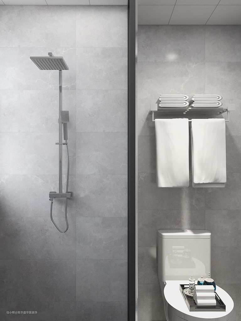 卫生间干湿分离干区用厨房白色冰箱隔开,洗手台下面放一个地漏。