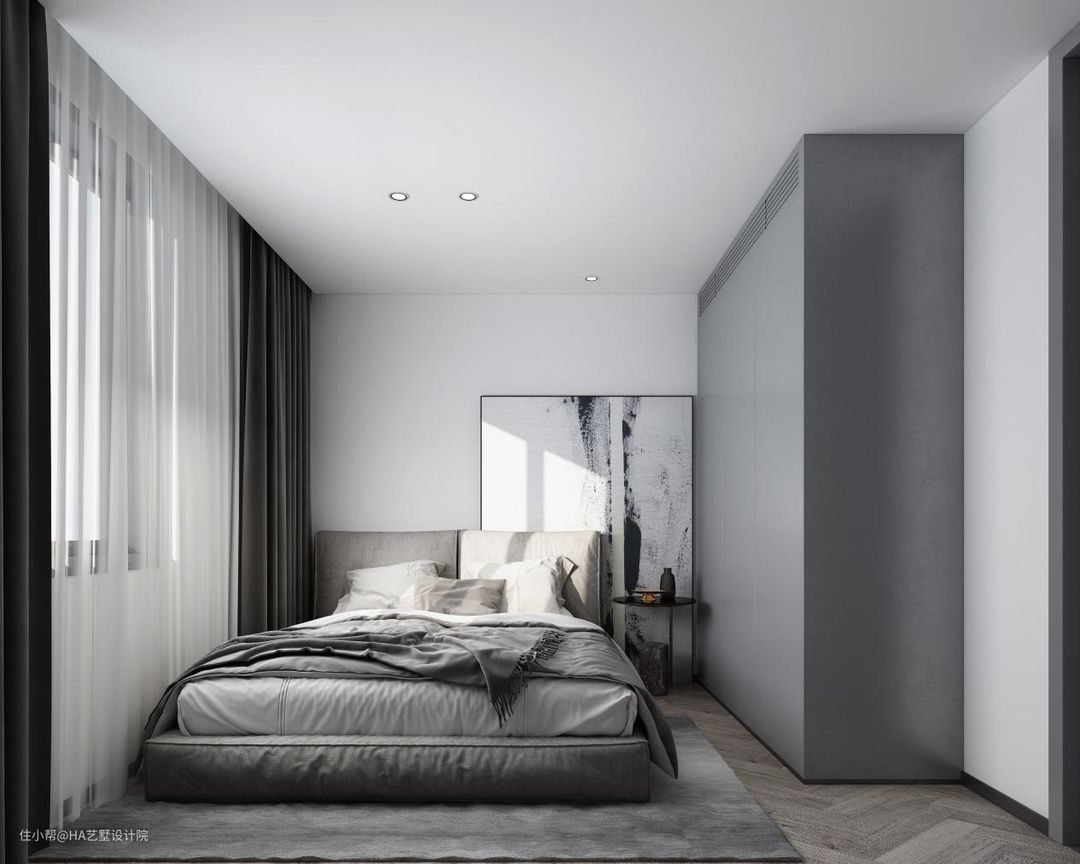 作为客房使用的次卧空间较小,所以在设计上显得更加简洁,整个空间墙壁、吊顶未做任何造型设计,并且吊顶顶部也用筒灯取代吸顶灯作为空间的照明设备,让空间看起来十分干净。在床头背景墙位置使用了灰白色的现代艺术画作为装饰,让卧室有了现代艺术元素。