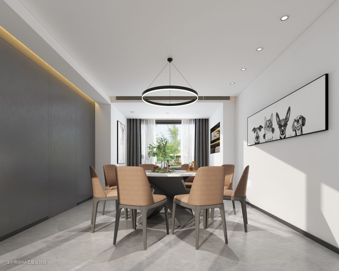 餐厅的背景墙选用了更沉稳的灰色,和空间中大量的白色进行搭配,平衡了大量白色带来的轻浮感,让空间保持了视觉上的稳重,在背景墙上方安装暖色灯带,并且餐厅的餐椅同样选择了浅棕色,这两个元素的加入,让餐厅更有温度,在加上前方的绿植,共同营造了一个温馨且自然的用餐环境。