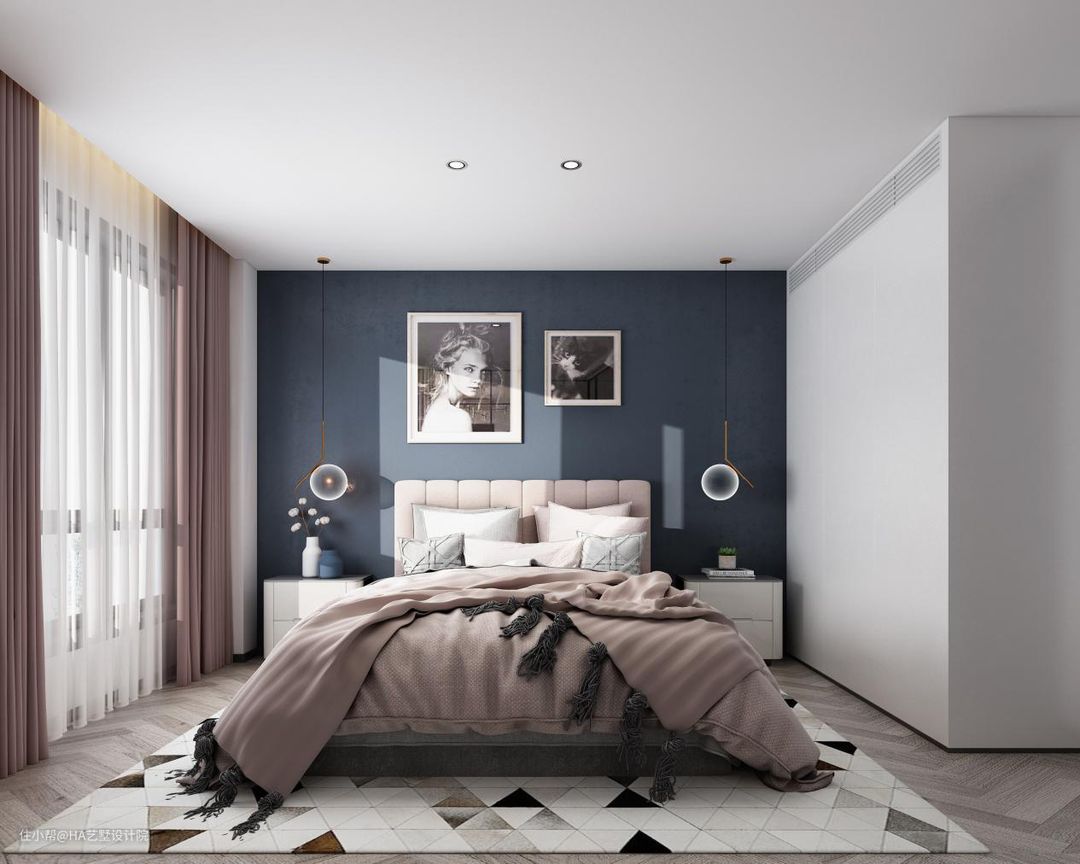 女儿房的设计则照顾了孩子自己的喜好,在房间中加入了粉色,色彩更加丰富,打破了极简风格的冰冷感,让空间更加活泼。另外,床头背景墙也从灰色换成了深蓝色,并在床头的两侧安装了柔光小吊灯,在床头柜上也使用了插花作为装饰,这些设计让女儿房充满柔和的女性美。