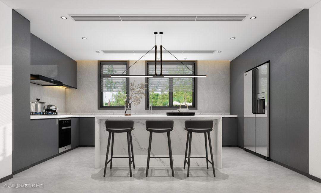 厨房同样采用了灰白搭配的色彩设计,在厨房中所有的橱柜都使用了无造型的灰色门板,并且这些门板都使用了免拉手的设计方式,让表面看起来更加平整,尤其是右侧的一整排高柜,从底部到吊顶沾满整个空间,和墙壁几乎融为一体。在高柜中间预留了一个空间,冰箱正好放到这个空间中,这些设计让厨房显得十分简洁。