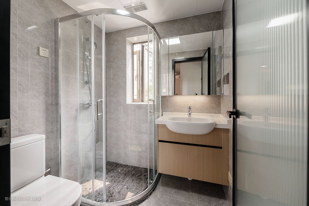 最后就是如果做这种局部隔断的话,卫生间的空间应该怎么搭配,叁工这边建议的是经典的小白砖铺贴或者浅色灰色的瓷砖铺贴,整体干净明亮,而且专户流出也更加的繁华,采用黑色质感的局部玻璃隔断分割空间,让整体空间看起来更有层次感和独立性记起来了挡水的作用,又提高了整体的颜值,前面的空间可以采用灰色的瓷砖尽量采用高光的瓷砖普及水流,而且也不容易藏纳污垢