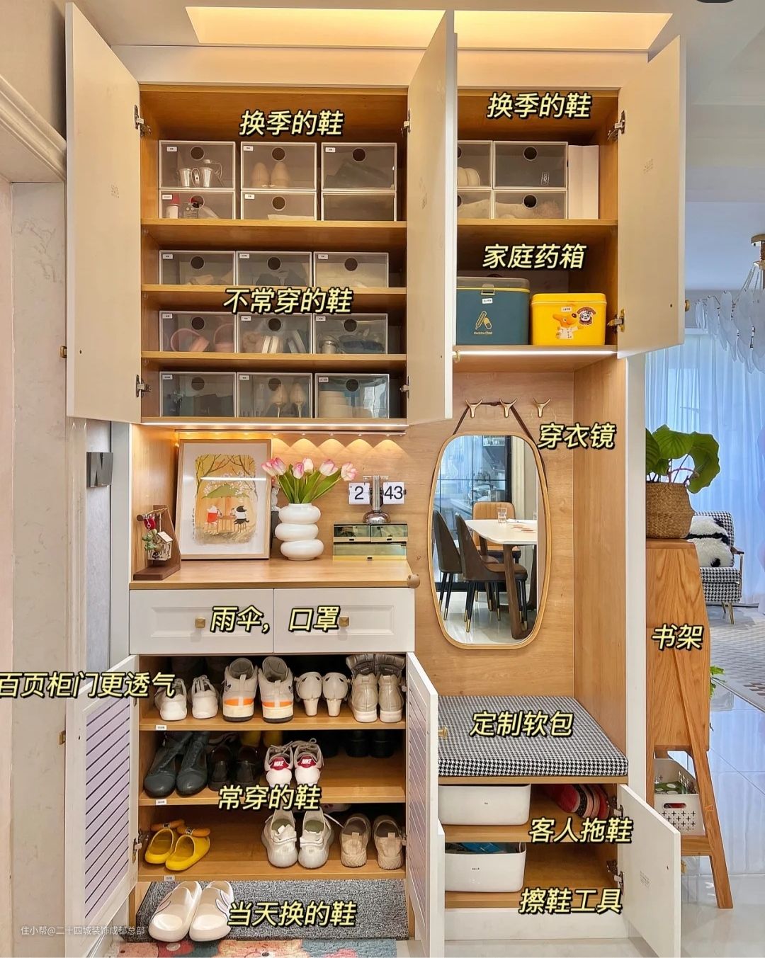 玄关是一个家的脸面,要简洁实用,特别是要做好收纳规划,让眼光所及之处没有太多杂物,顶天立地鞋柜的深度是59cm,最浅不要少于35cm!下层的柜门设计了百叶窗,一般是常穿的鞋透气性更好!
