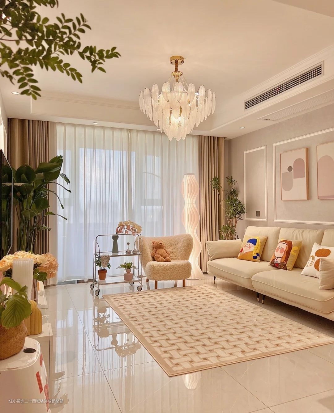 法式风格的浪漫水晶吊灯是客厅软装的点睛之笔,回家打开灯的时候浪漫又温暖,水晶玻璃氛围感满满,暖暖的灯光照亮每一处精心布置的细节~所有的温柔都无处藏匿,奶白色的沙发不仅颜值高,跟家里的简约装修很搭,平时特别喜欢窝在这里追剧~放几个卡通抱枕,温馨浪漫。