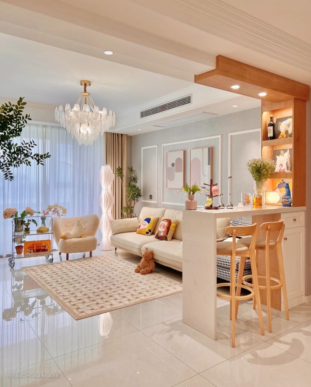 玄关往左就是我家的奶白色系的客厅啦~没有固定的风格,简单的装修随着软装的改变而呈现不同的风格,小吧台设计真的爱了,平时在这里喝茶,吃零食,夏天的风吹过窗帘,白纱在风中翩翩起舞真是美,米杏色窗帘和奶油系的小家搭配真是绝绝子~