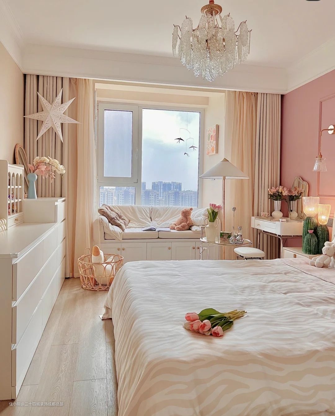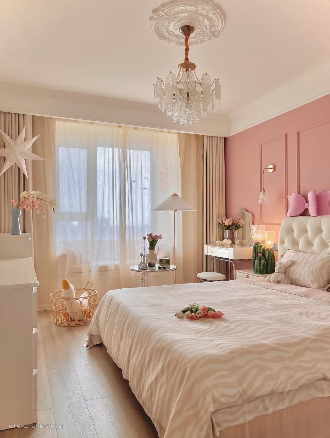 主卧背景墙面是蔷薇石膏线,其他三面是奶咖色!,水晶吊灯真的太美了,珍珠装饰细节满满~一开灯让整个卧室都变得温柔起来。搭配灯盘感觉卧室瞬间变得法式温柔~奶白色的窗帘搭配梦幻的亮丝纱,闪耀着纯洁的光芒,微风吹拂,纱帘在风中翩翩起舞,整个卧室仿佛撒上金色的光芒,治愈了一切不美好。