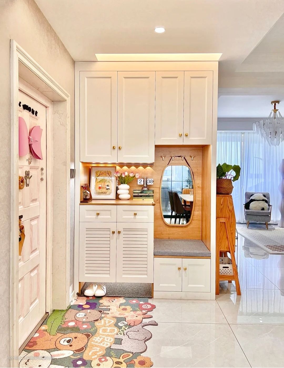 鞋柜设计了换鞋凳子,距离地面高45cm刚刚好,换鞋不费力,并且换鞋凳下做了柜子,放一些鞋套鞋垫的擦鞋工具很实用,底部悬空可以放置当天穿的鞋和拖鞋!置物区的高度是45cm放置了好看的置物架,可收纳钥匙香水和手表等,顶上有自动感应灯,回家就可以看到暖暖的灯光,很有氛围