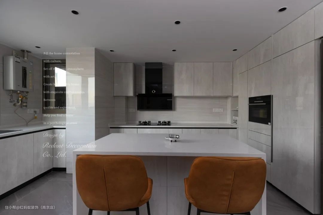 储物作为首要的重点工程,从房屋结构上将北阳台融入厨房空间,增大了U型橱柜的定制面积,同时增设的岛台也成为日常备菜和简餐的首选之地。
