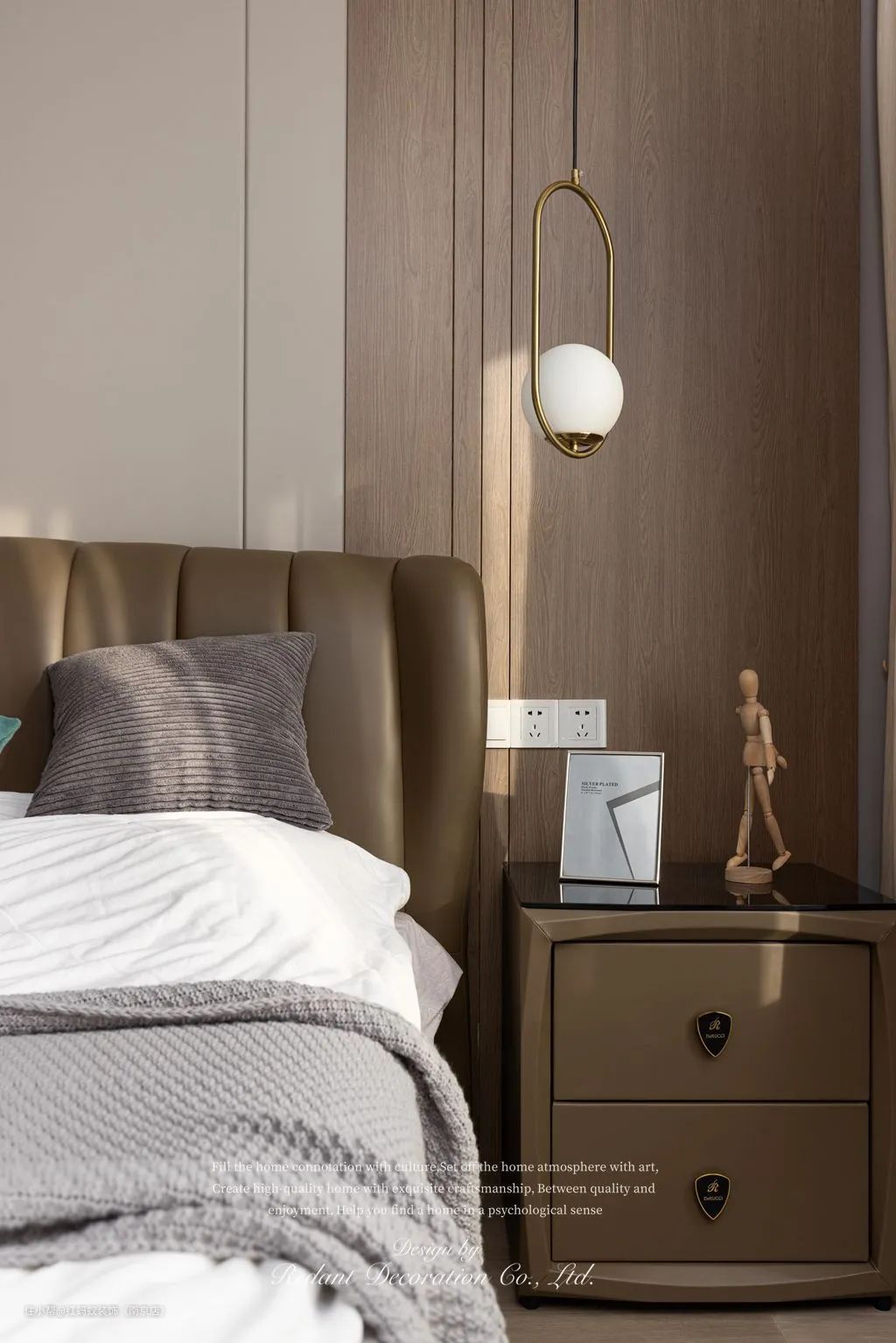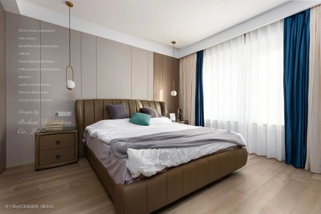 主卧的2米大床,无形中给人以一种舒适的温馨质感,硬包与木饰面组成的床头墙面背景,更是连接着整个卧室的软硬装,使其成为整体。