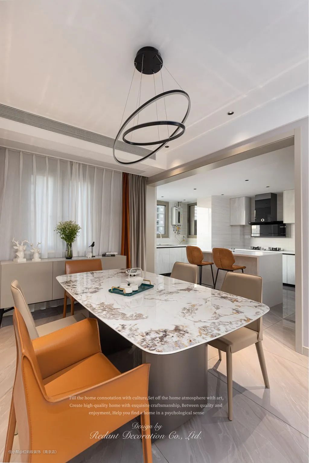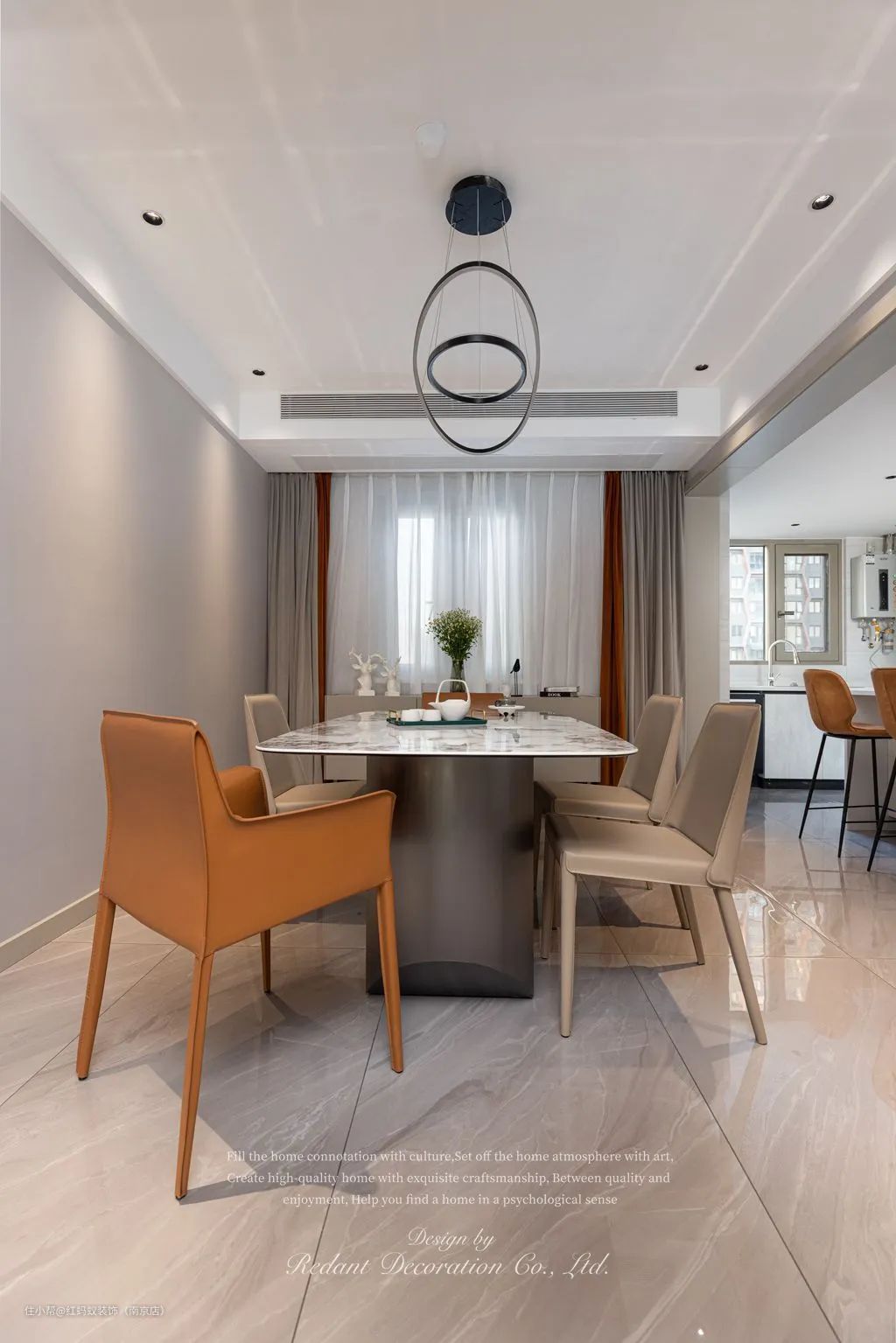 而浅棕色与爱马仕橙的色彩组合,不仅呼应了客厅的沙发点缀色,更是丰富了整个餐厅的色调,让用餐时的关注点不仅限于餐食上
