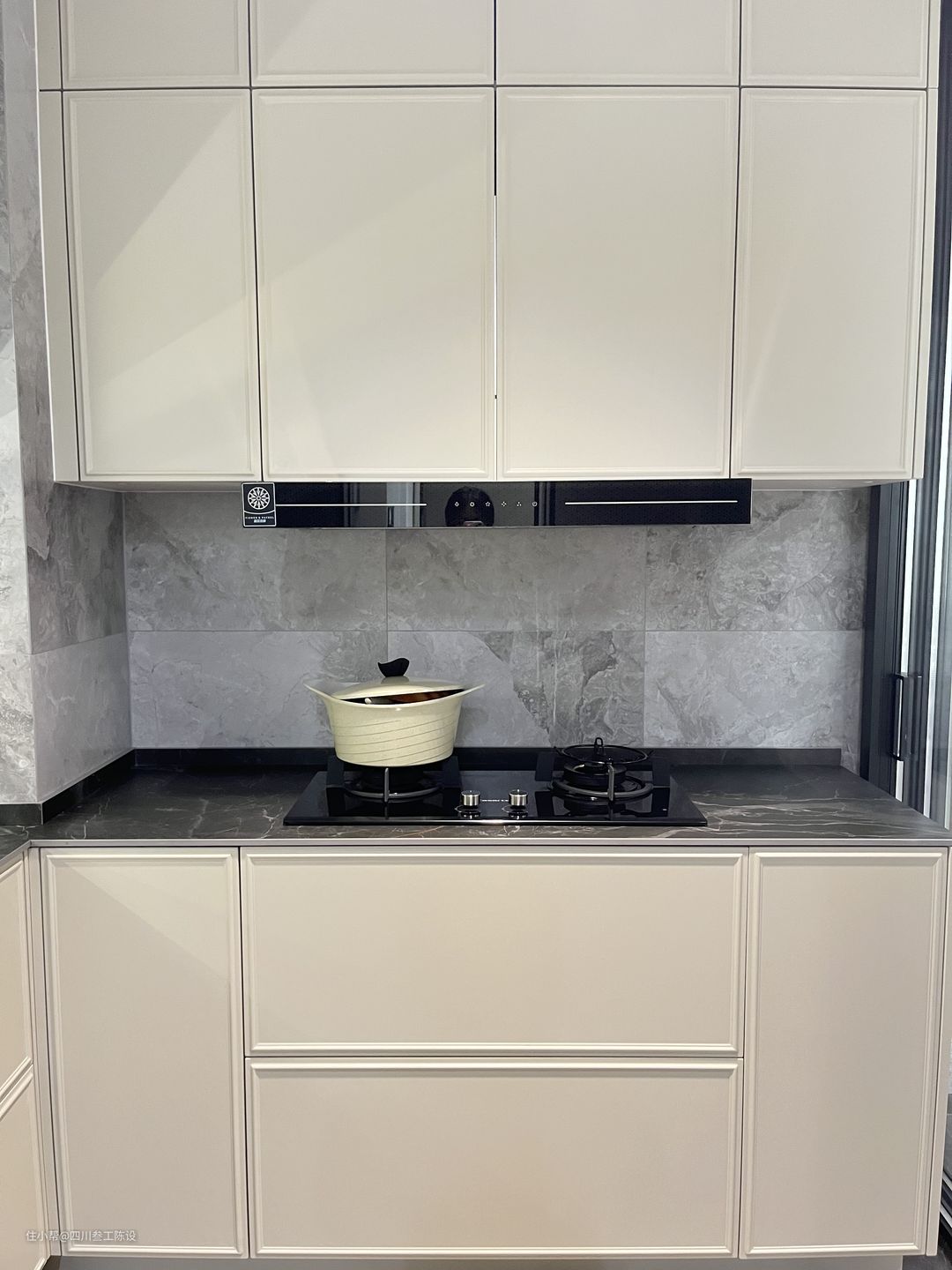 厨房门也是一样的道理,但是厨房和卫生间还是有一定的区别,因为整体的环境是不一样的,卫生间比较潮湿,是坚决不能够做木套的,但是厨房一般是不会有水的,就算有,也只是一点溅出的水滴,无关大雅,所以是能够装木套门的,可以和房屋的卧室木套门保持整体上的统一,这样做,厨房的瓷砖就不用贴出门洞,只贴到门洞的内部或者直接平齐就可以了,当然如果想省下这笔预算的话,是可以直接不装木套的,就挂轨道做一个简约的玻璃推拉门,用瓷砖封口。