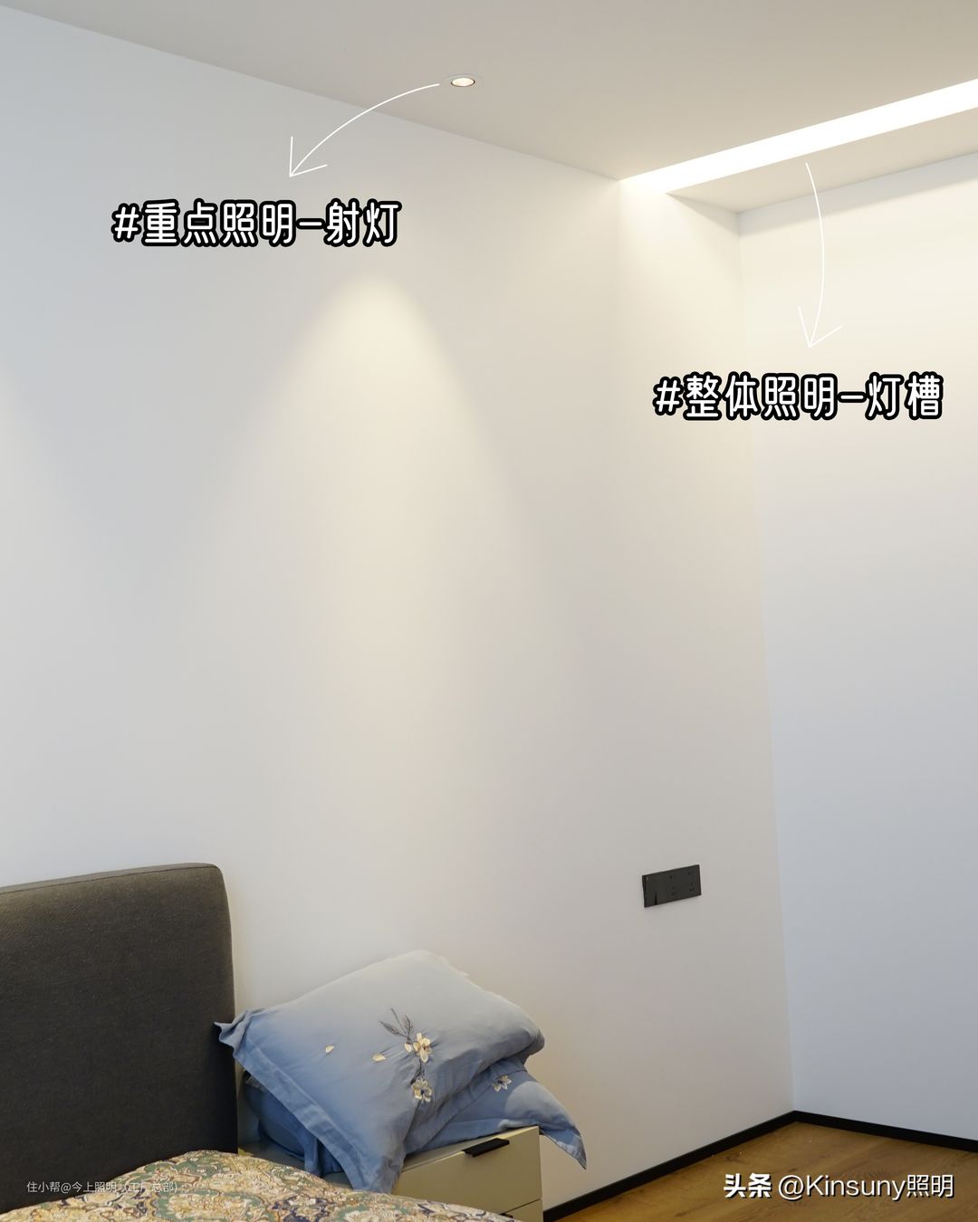 卧室的灯光简约却不简单,由灯槽与射灯组成,柔和的环境光和床头床尾的重点光相辅相成,呈现出有层次的舒适环境,满足睡眠和阅读的不同灯光场景需求。