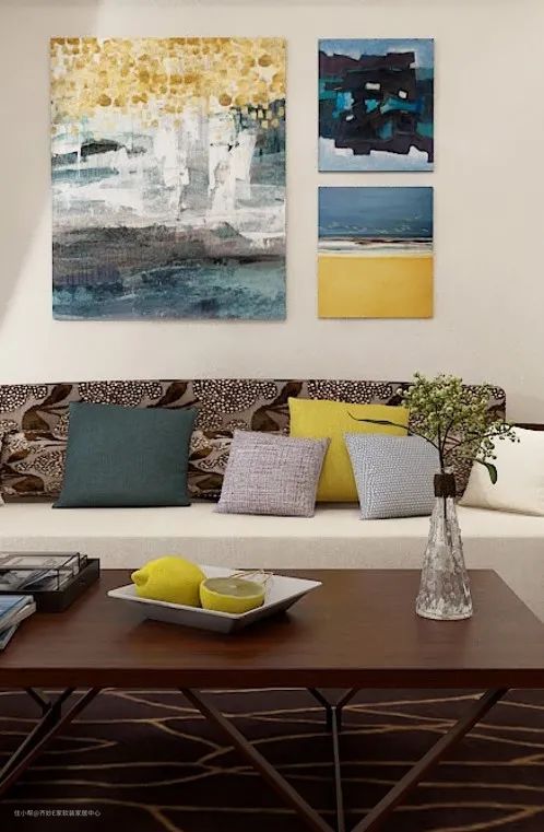 装饰画作为家居艺术品时,主要以观赏性为主,如壁画、挂画等,当它与实用性家居艺术一起搭配与互动时,能够呈现出更好的艺术效果和氛围。