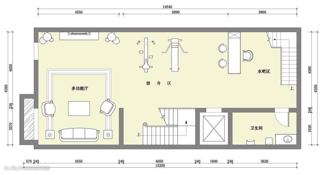 业主一家人都很注重身体健康,希望在家中设置专门的健身区供他们锻炼身体使用。另外,家中还要设置水吧台、多功能区等区域,供日常休闲使用。
