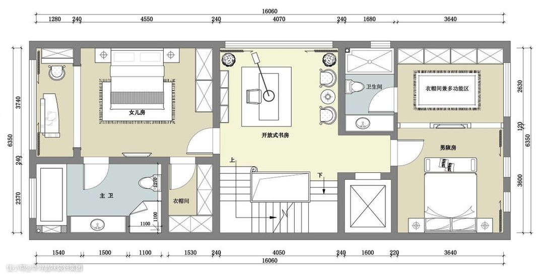 业主想给孩子创造更好的读书环境,要求在二层设置开放式的书房供孩子们使用。另外,业主还希望设置独立的洗衣房,专门用来清洗衣物。
