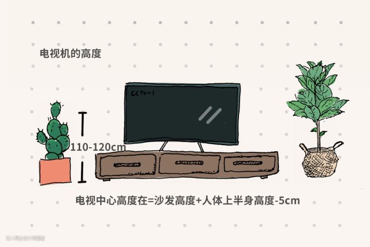 - 电视悬挂高度以电视中心位置为准,电视中心位置=沙发高度+人体上半身高度-5cm,这个高度是坐着上方上看电视比较舒适的高度。