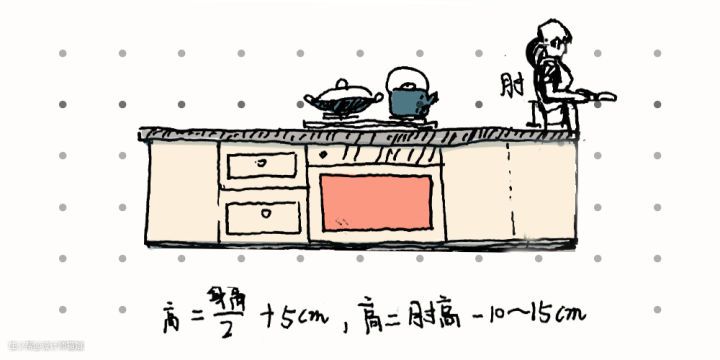 地柜高度:高度85-90cm,跟使用厨房人的身高而定,计算公式写在图上了。