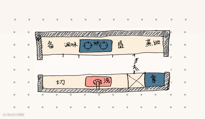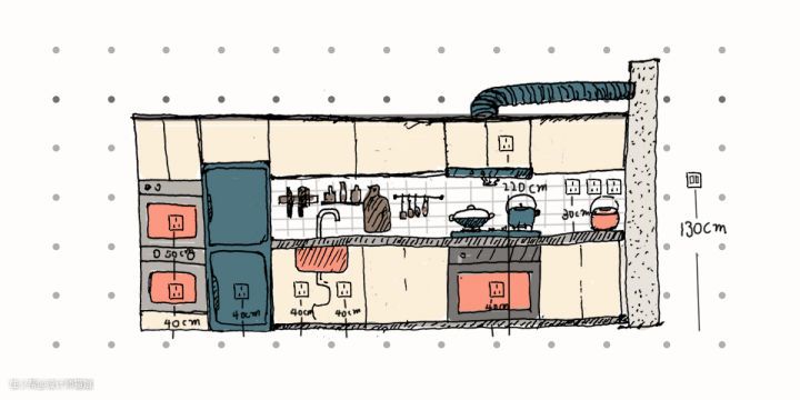 这个区域可以放置很多常用小家电,电饭煲和豆浆机等,宽度可以设计在50-70cm。
