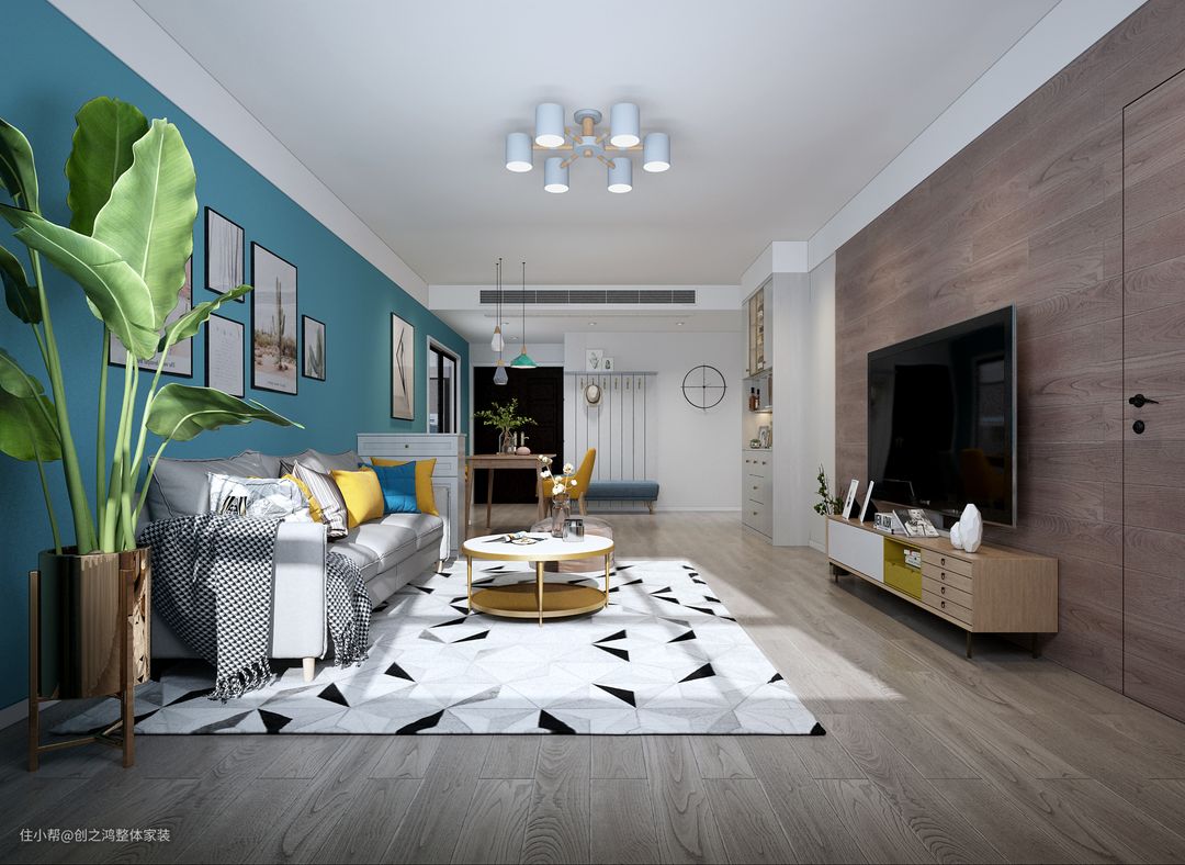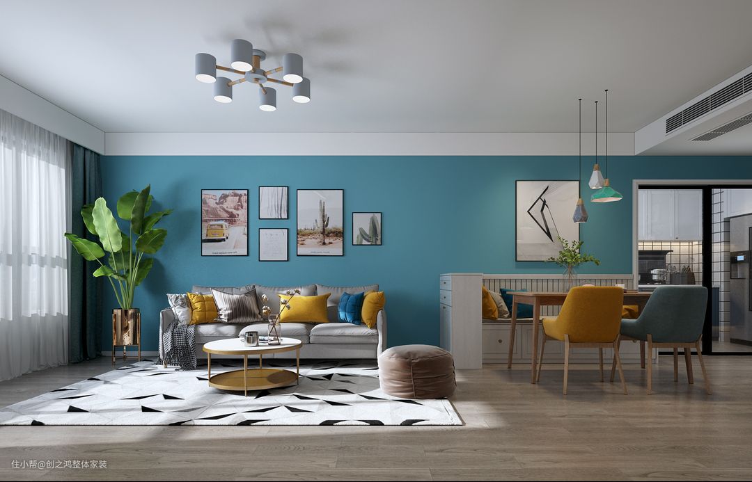 109㎡清新北欧风,客厅孔雀蓝加原木的配色真的太绝了!