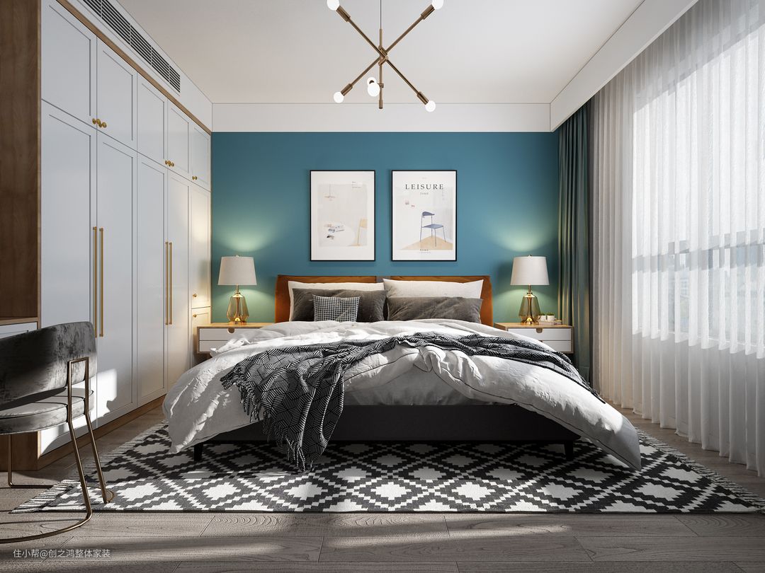 主卧空间比较大,延续了整体一致的色调,以孔雀蓝为主,考虑到整体空间是私密的,我们选择主光源和辅助光源的设计,营造良好的氛围感;考虑到女主人日常使用的需求,在床尾一侧我们做了梳妆台,合理利用空间!
