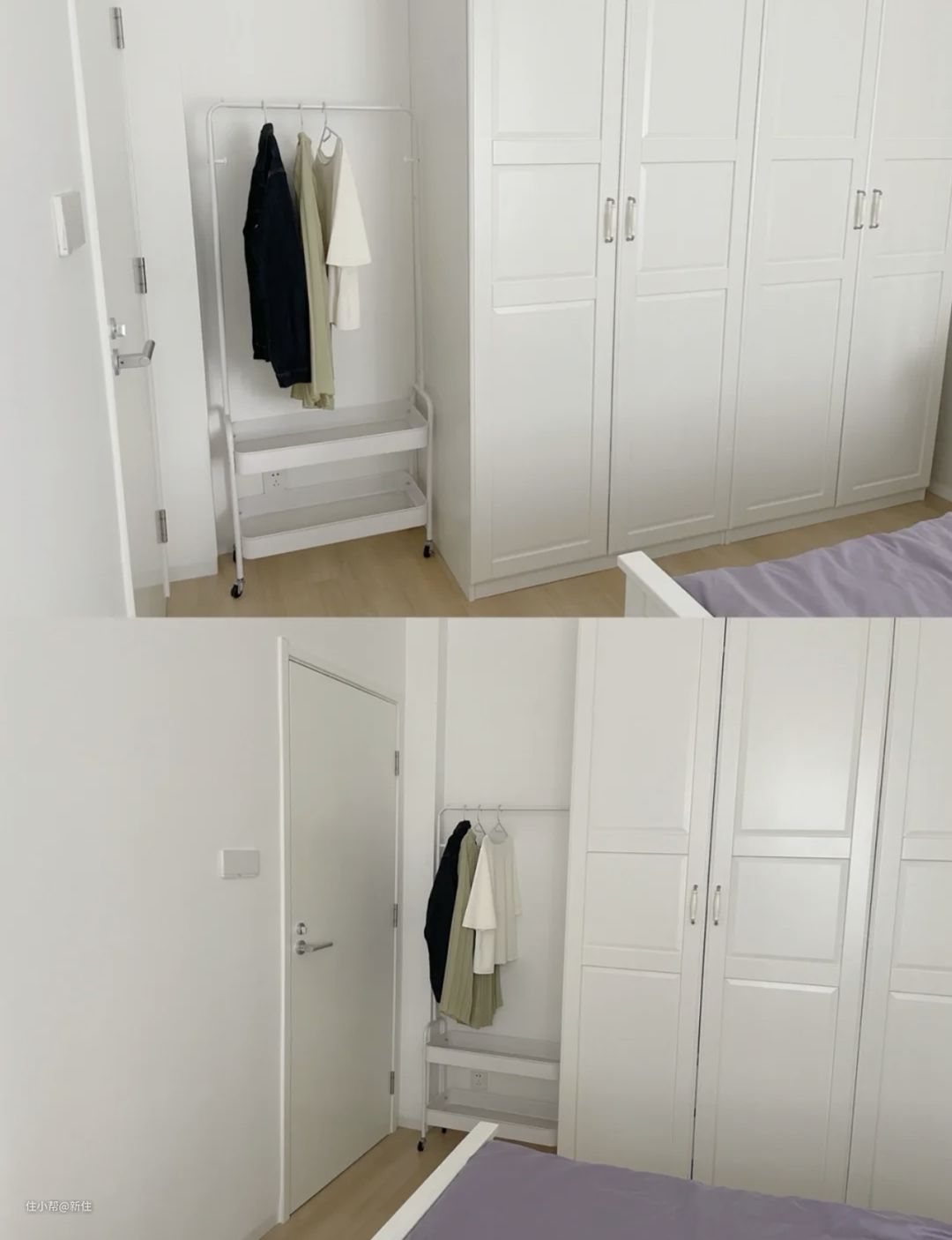 刚好一般的衣柜,又没有次净衣的收纳区,而,这种朝向开的门,门套一般不会贴墙包,那么,在此处放一个次净衣架,就再合适不过了。