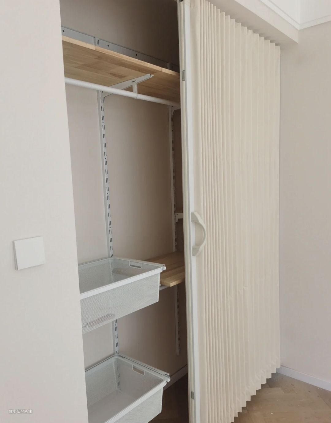 门后空间利用上之后,房间里再也没有乱堆的衣物了,而且,底下的两层置物层,还可以摆放一些需要用、又无处安放的杂物,是既隐蔽又实用。