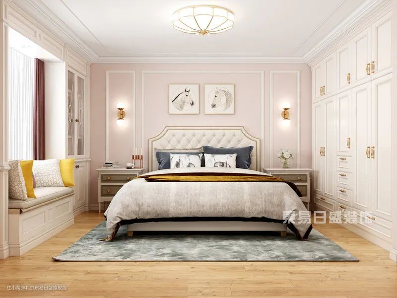 素雅的米白色充斥着整个空间,但又因为家居材质的不同,层次感分明,不会显得无趣、沉闷,反之空间看起来更加明亮、柔和。大气的石膏线做床头背景墙,让室内看起来更加的华丽,精致的插花作为点缀,靓丽又有趣。