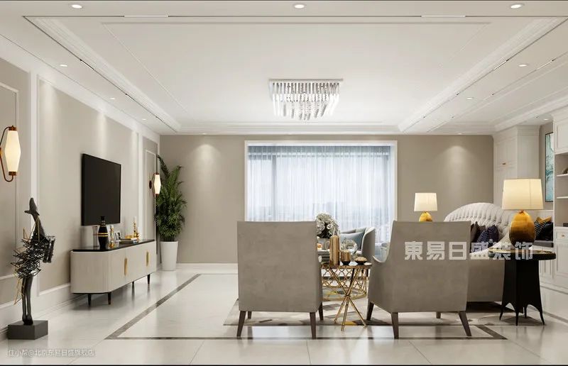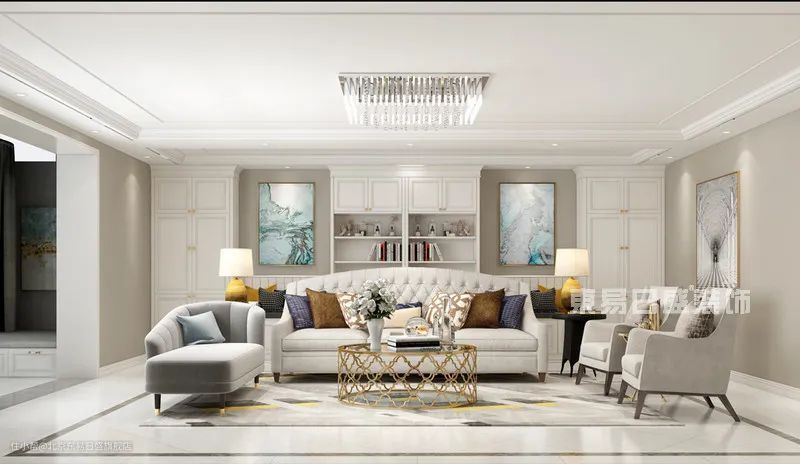 客厅以现代舒适与轻松年轻的色调与质感,搭配上美式元素的家居软装,融合了现代舒适的轻松氛围,又有着美式端庄的高档气质。