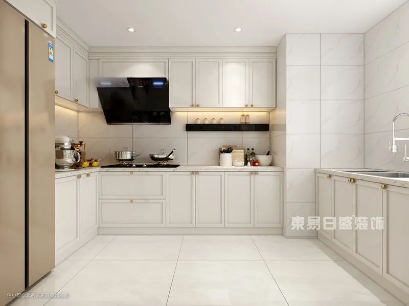美式复古拼花,灰色大理石台面和白色实木柜门,嵌入式设计让厨房一气呵成,干净整洁,清新中透漏着文艺。