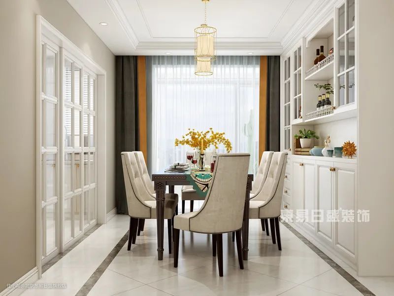 美式风格向来不讲方圆规矩,反之,随心所欲的风情更别有一番风味。餐厅桌椅充满高级的精致感,灰色皮质的椅子带来舒适自然之感。侧边纯白色到顶的收纳柜,扩大了视觉,增加了通透感。