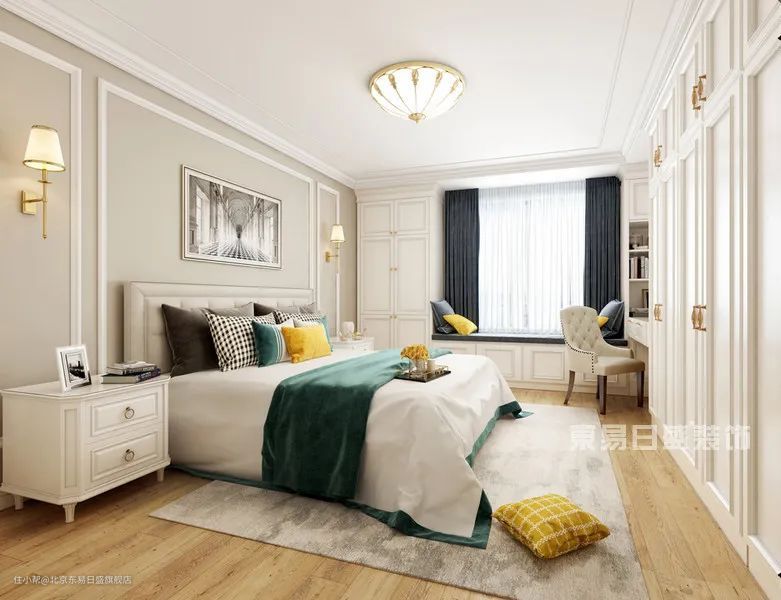 次卧延续了主卧的色彩,看起来丝毫不输。高级质感的床品搭配金属色的床头柜,红色的线条看起来也无比的生动,别有一番情致。设置一个独立的办公区连接整面的衣柜,当阳光透过白色的窗纱洒向室内,生活的美好就此绽放。