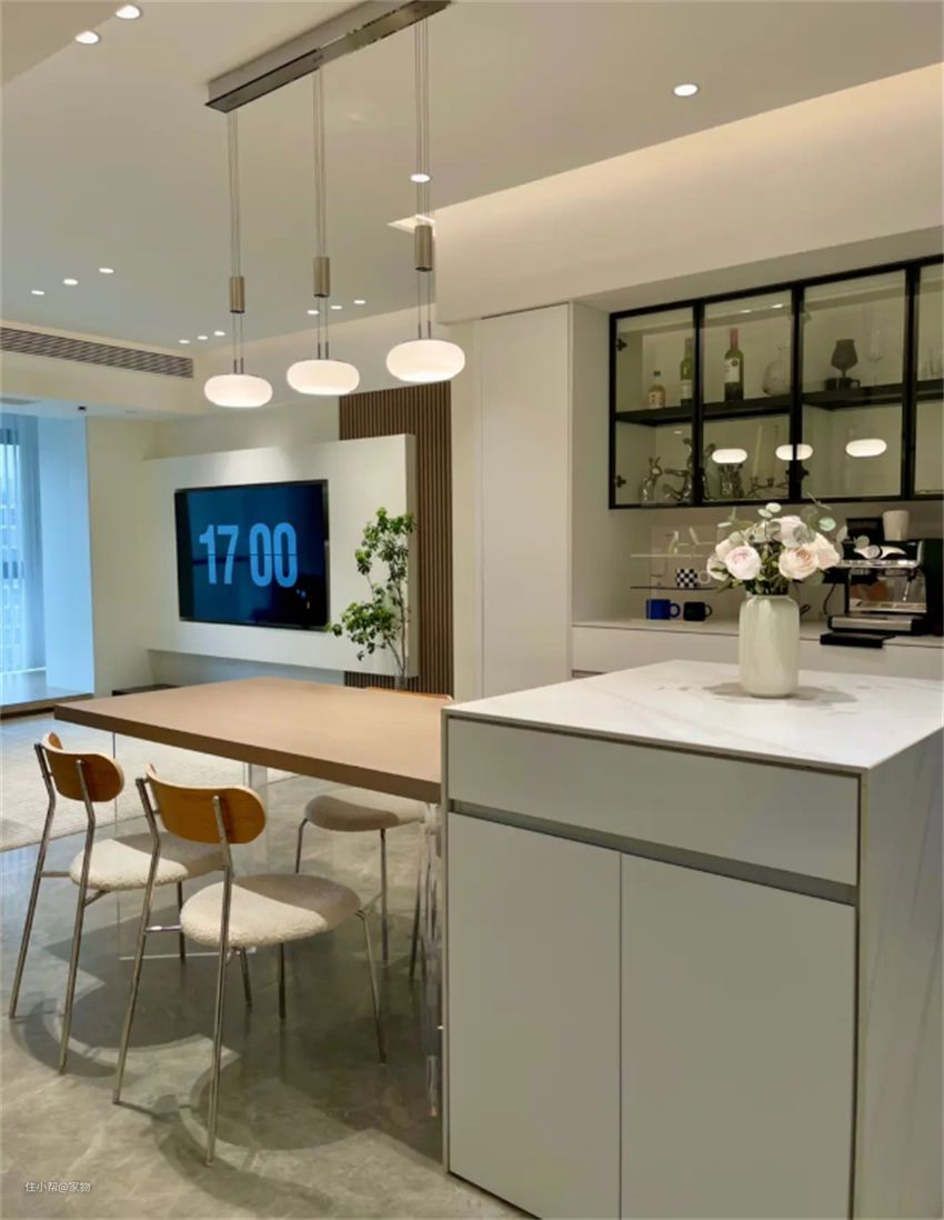 这里不再仅仅局限于用餐,还能作为日常休闲的茶吧或者料理烘焙台,甚至可以作为临时的办公场所,相较于单独的餐桌,岛台+餐桌的模式,让空间的利用率变得更高。