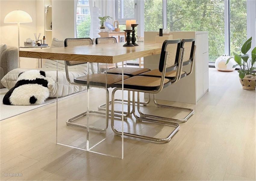 同样钢结构打底,只不过另一端用亚克力桌腿做支撑,通透度高,远远看去近乎于无,餐桌浮在空中,充满梦幻感。
