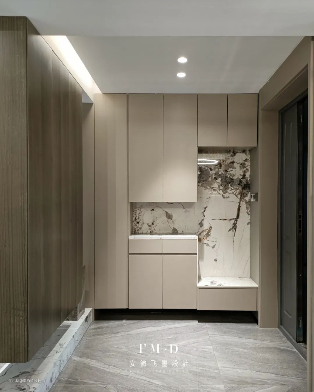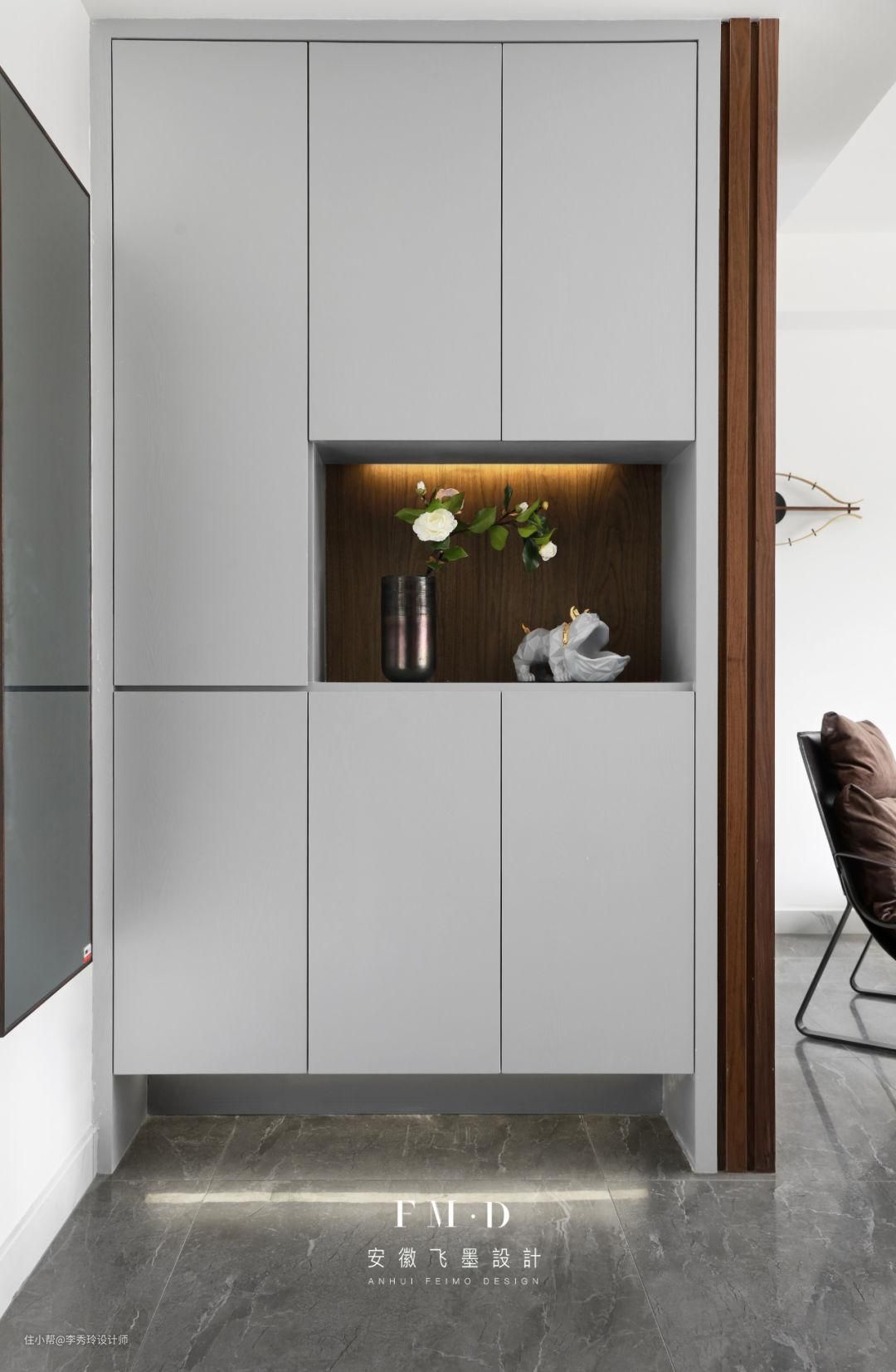 大小户型都能如此设计。如果垂直于玄关的一侧墙体空间不足,那么还可以考虑在与入户门平齐的墙体设计柜体收纳。