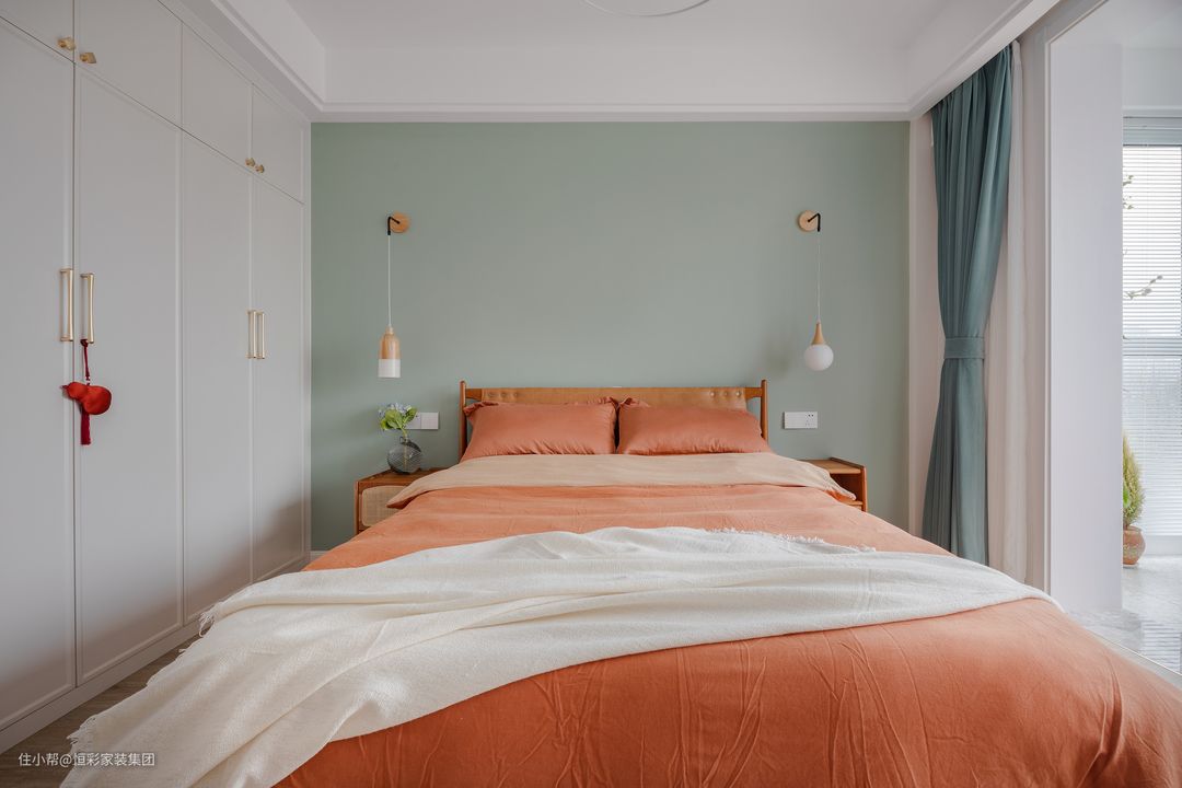 床头左右两侧的柜子预留两个小小的壁龛,也能作为床头柜使用,躺在床上,不会觉得视线拥堵,晚上放置杯子、手机、私密物品,随拿随取很是方便。