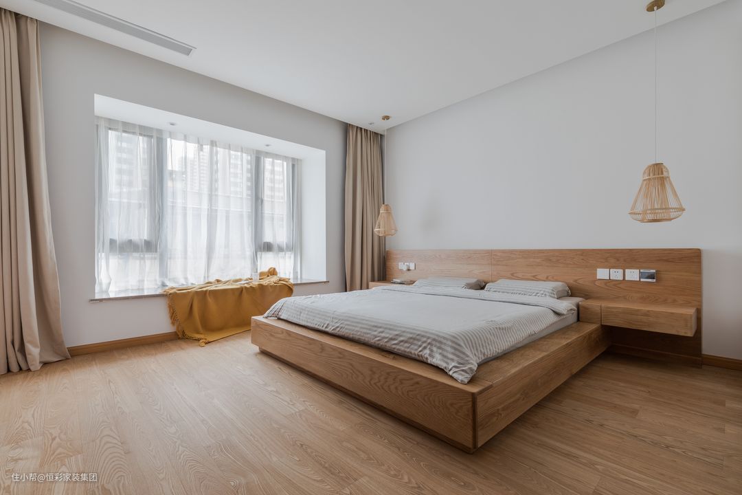 悬浮式床头柜与背景墙一体化定制,整体协调统一,节省空间又好看。比起传统床头柜,不易有灰尘,打扫卫生更省事儿,也让空间更轻盈通透。