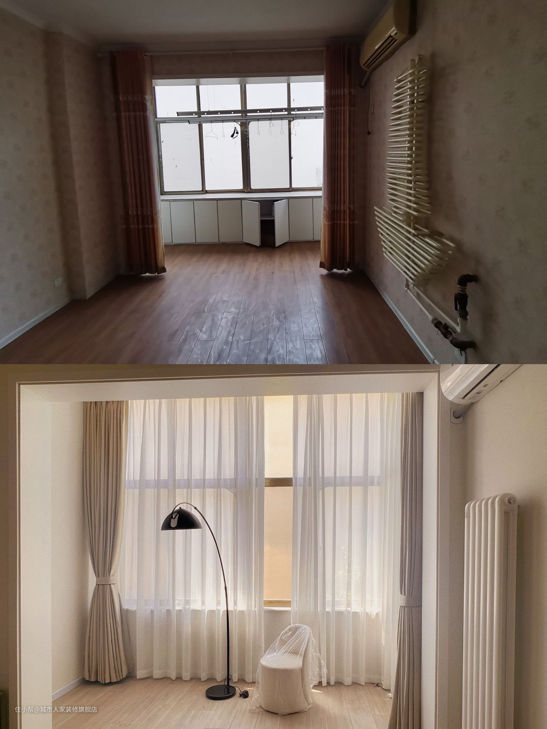 客厅图片二为改造前后对比。旧房中呈现出明显老旧气息,过时的墙纸与地板、泛黄的空调以及裸露的管线,都值得更新改造了。改造后呈现出清爽的氛围感。淡雅的墙面与浅色的木地板,营造出温馨的生活空间。