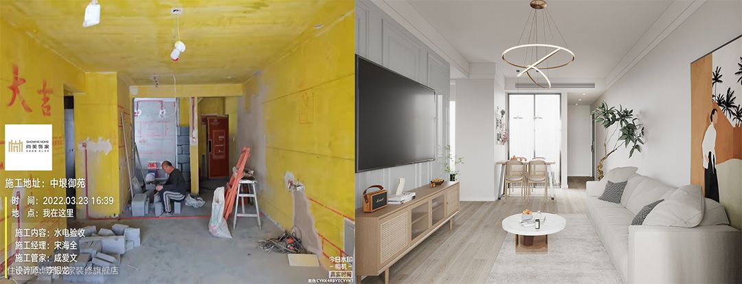 客厅图片一为水电改造后与装修交付后的对比,可以发现旧房拆改后,以全新的水电布局来提升房屋的功能性,适应现代家居理念,