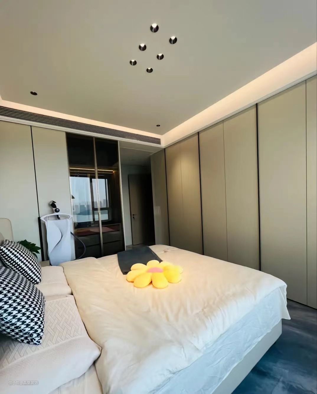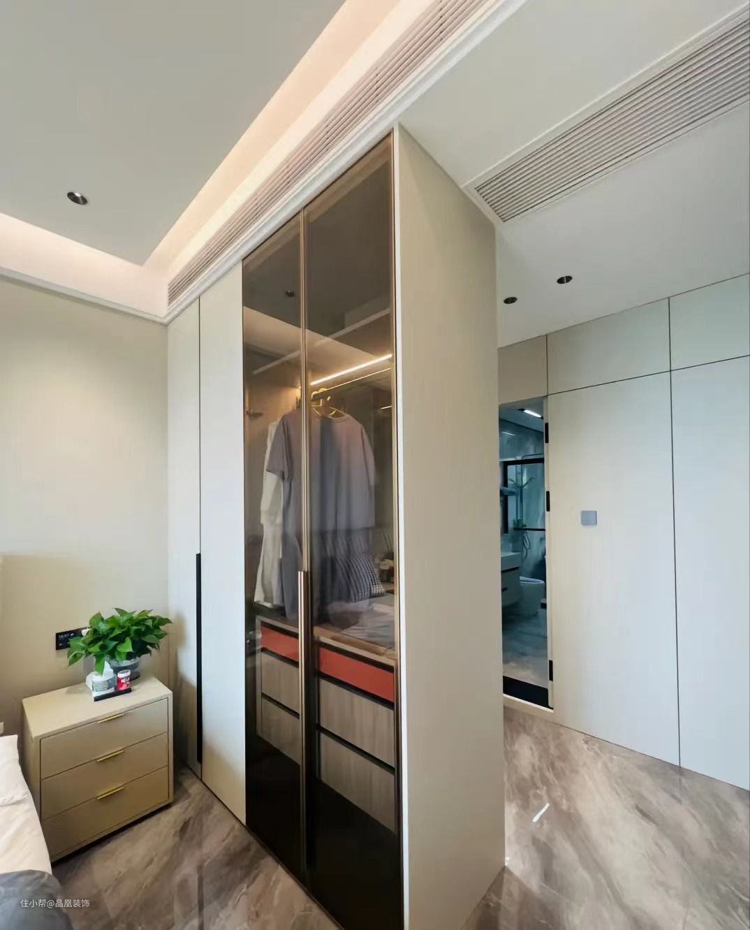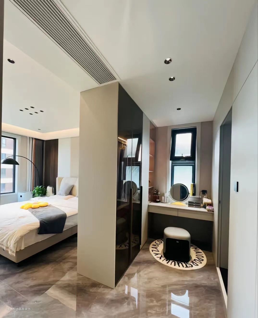 主卧的设计床头背景墙是pet肤感背景墙面,搭配钓鱼灯,床尾做的是一门到顶的衣柜,衣帽间的设计是隐形门的设计布局,卫生间的设计也是隐形门,主卫做的干湿分离,使用起来更加方便,采光以及色调的搭配,让空间显得不是那么拥挤,空间的利用率也达到了最高!这样的的布局,大家如果喜欢哪里的话,可以评论区告诉我哈