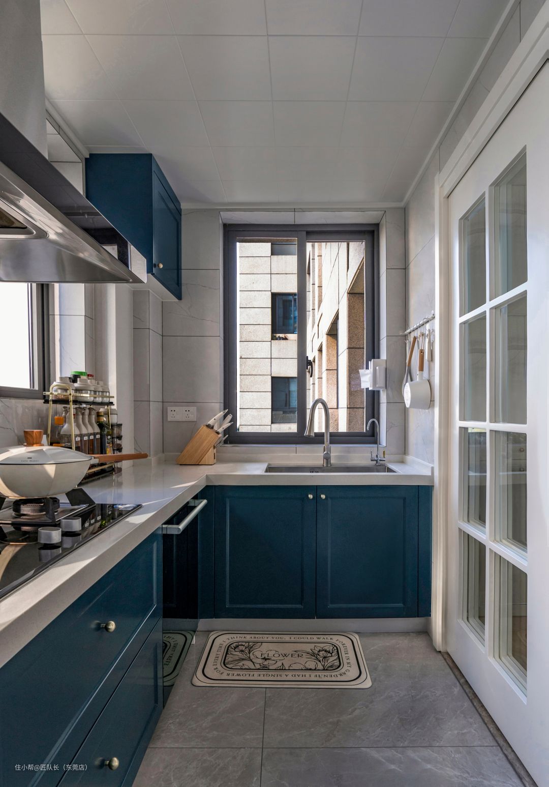 蓝色系橱柜,白色台面,柜门的造型是简单的回字型加圆形把手设计,搭配白色的高颜值奶油系锅具,瞬间提升整个厨房颜值。