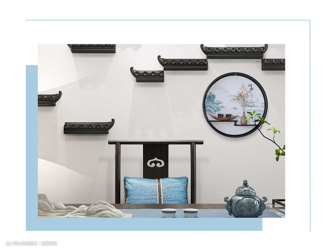 三、挂件装饰,挂件样式繁多,使用含有中式元素的挂件装饰于背景墙上,使用金属质感的祥云挂件,空间略带轻奢感。